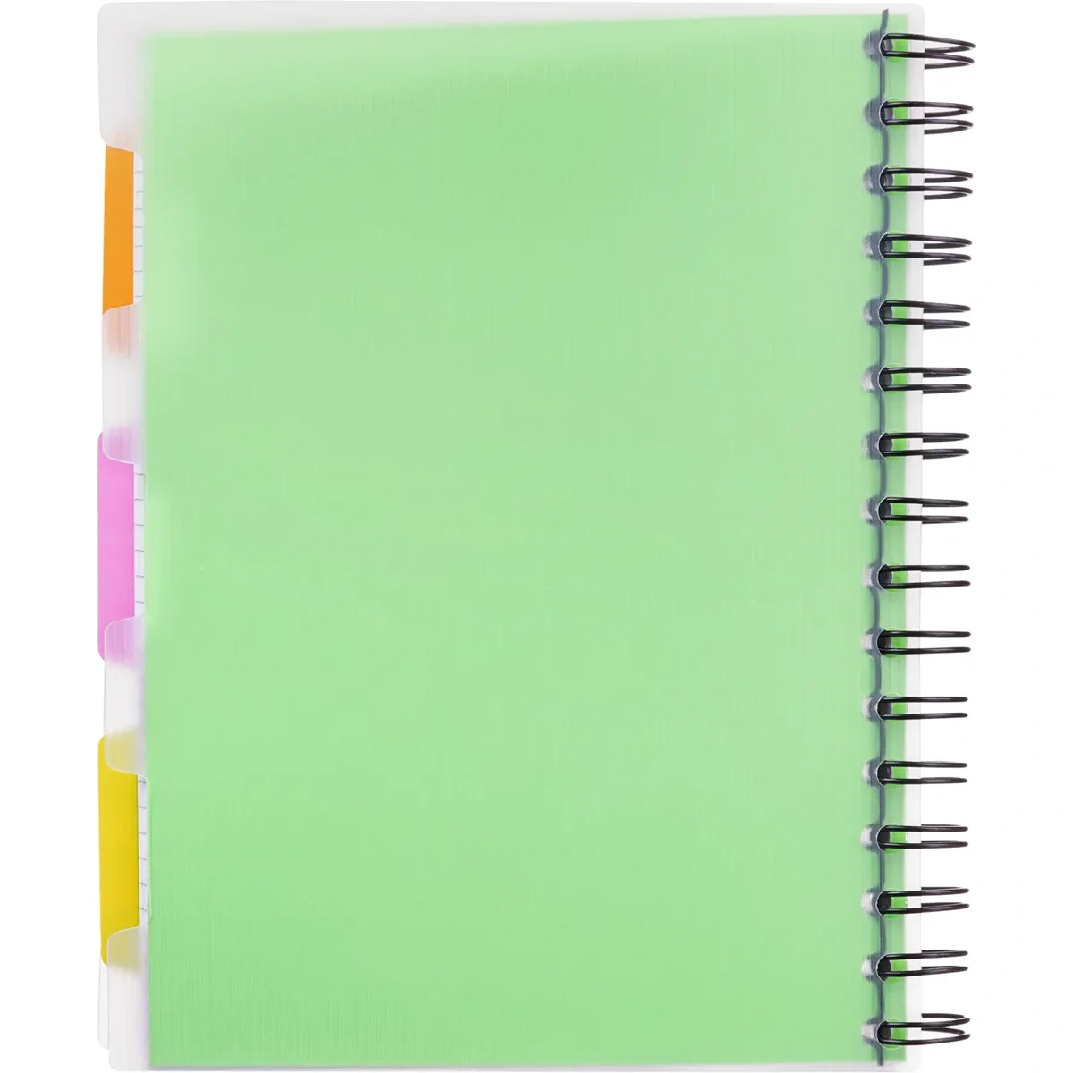 Бизнес-тетрадь формата А5, 140 листов. Обложка с вырубкой из жёсткого экологичного прозрачного пластика с волнистым рельефом, двойная толстая евроспираль, увеличенного диаметра. Пластиковые съёмные разделители. Первый лист из плотной бумаги с запечаткой, разлиновка в клетку с аккуратными полями. Салатовый дизайн. Размер — 147×204 мм.