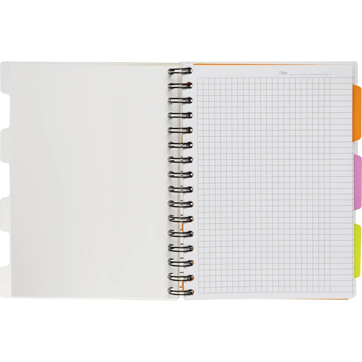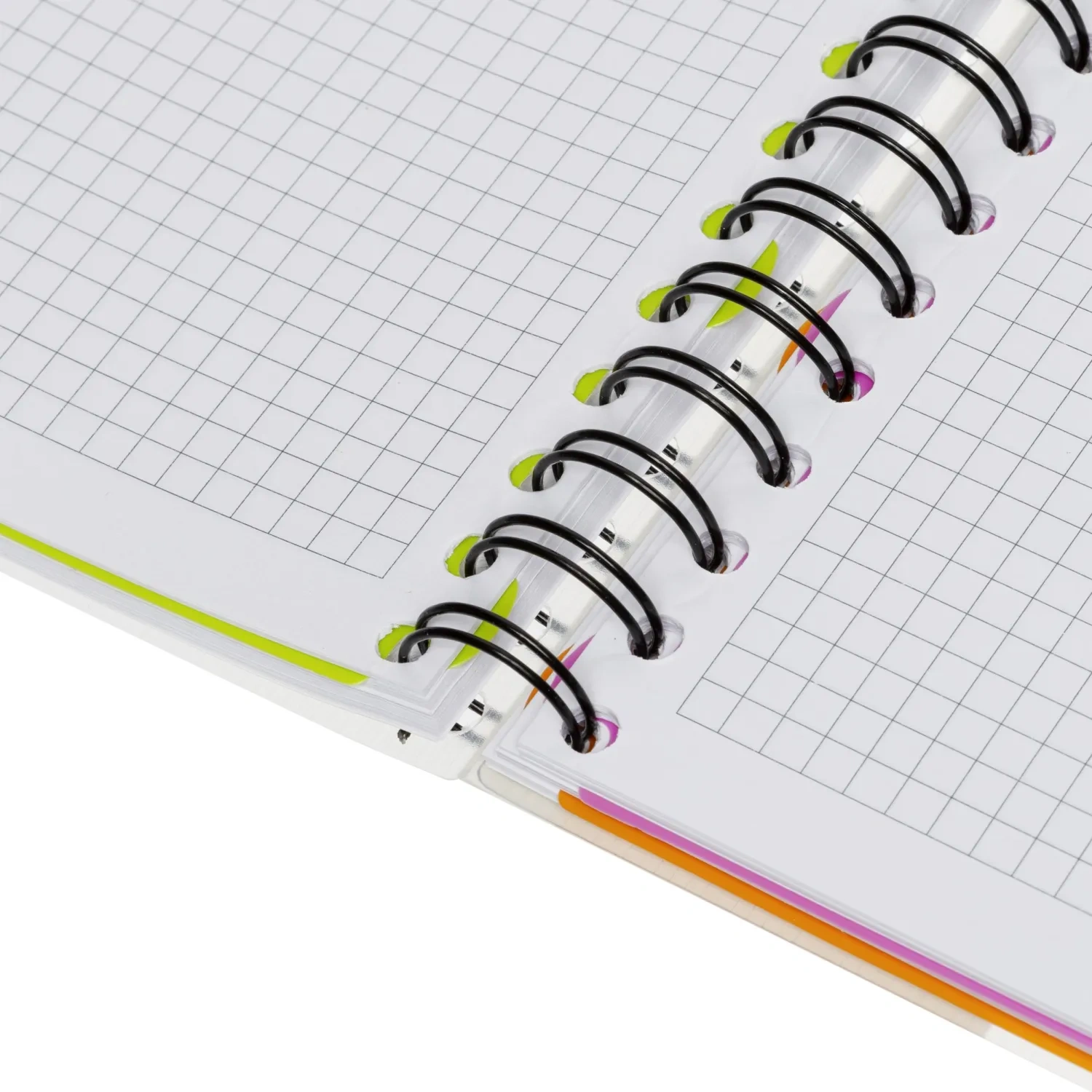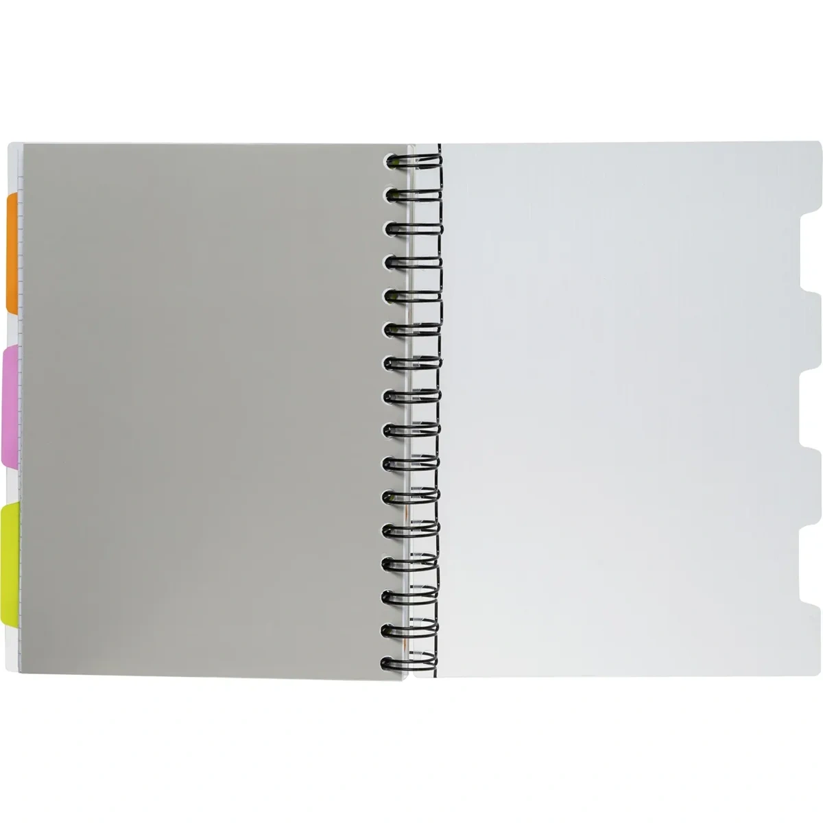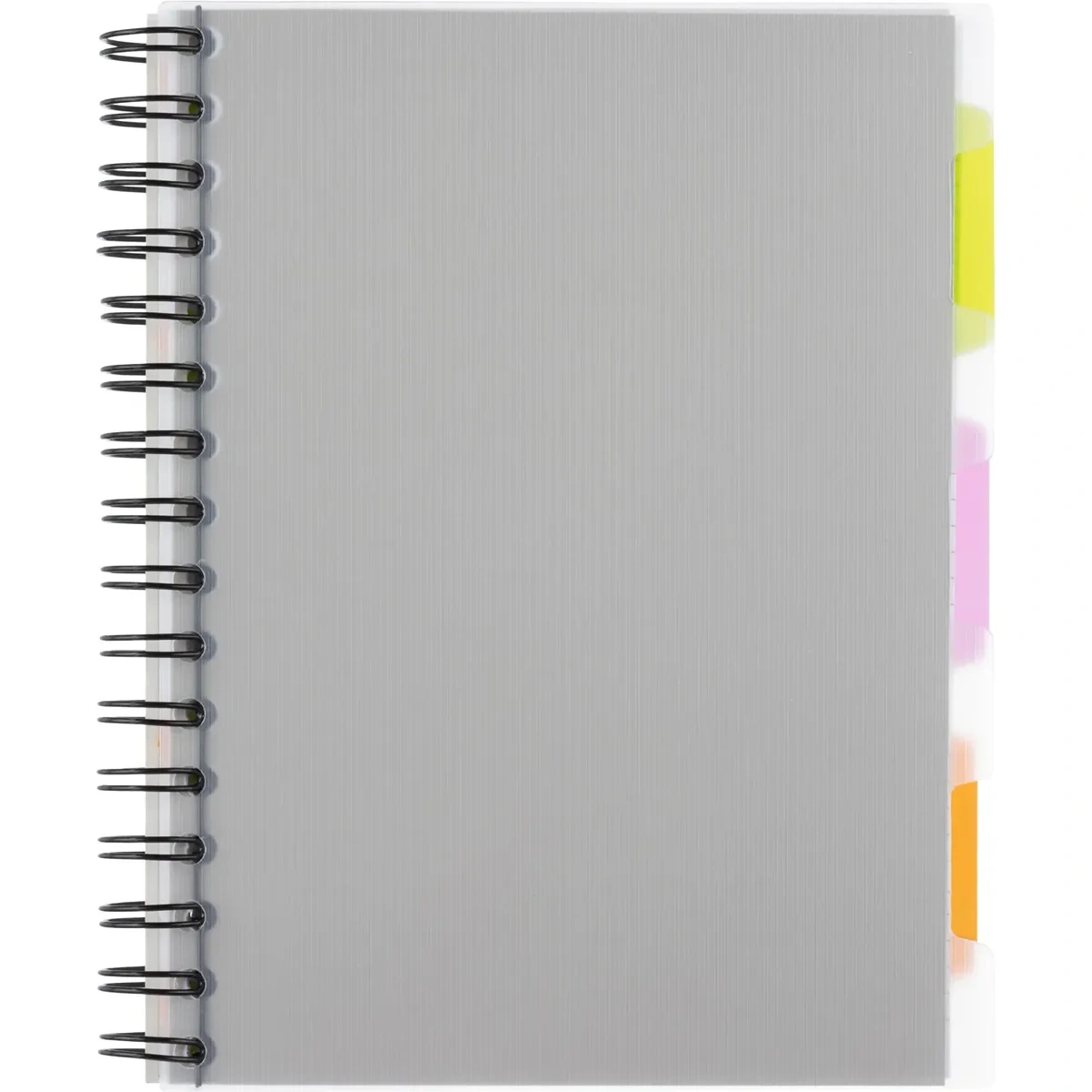 Бизнес-тетрадь формата А5, 140 листов. Обложка с вырубкой из жёсткого экологичного прозрачного пластика с волнистым рельефом, двойная толстая евроспираль, увеличенного диаметра. Пластиковые съёмные разделители. Первый лист из плотной бумаги с запечаткой, разлиновка в клетку с аккуратными полями. Серый дизайн. Размер — 147×204 мм.