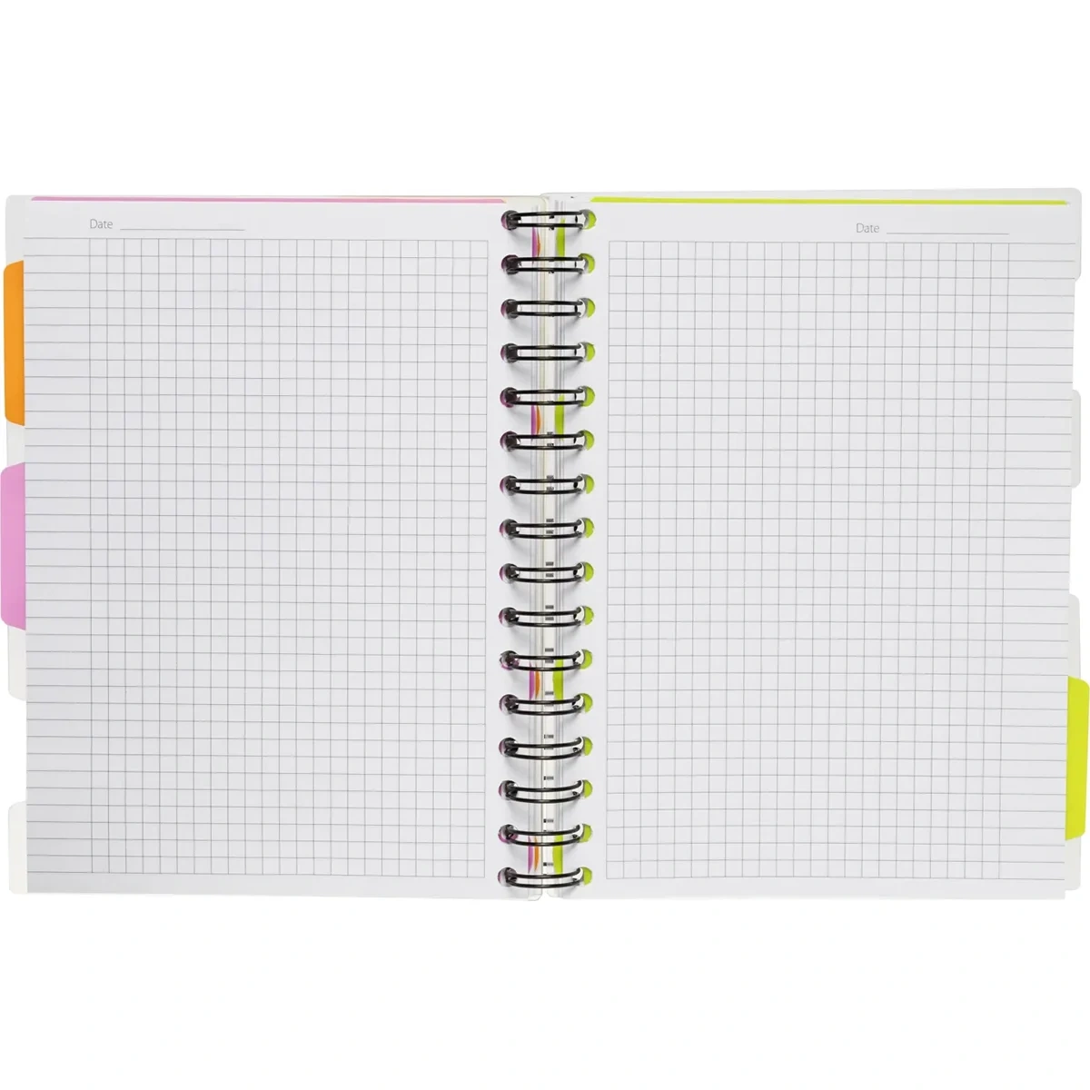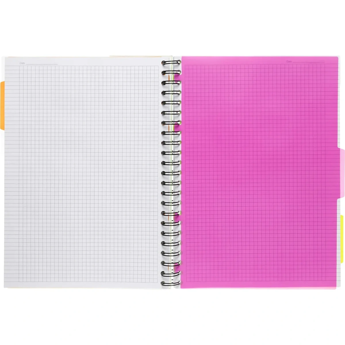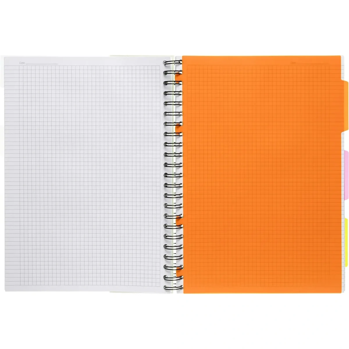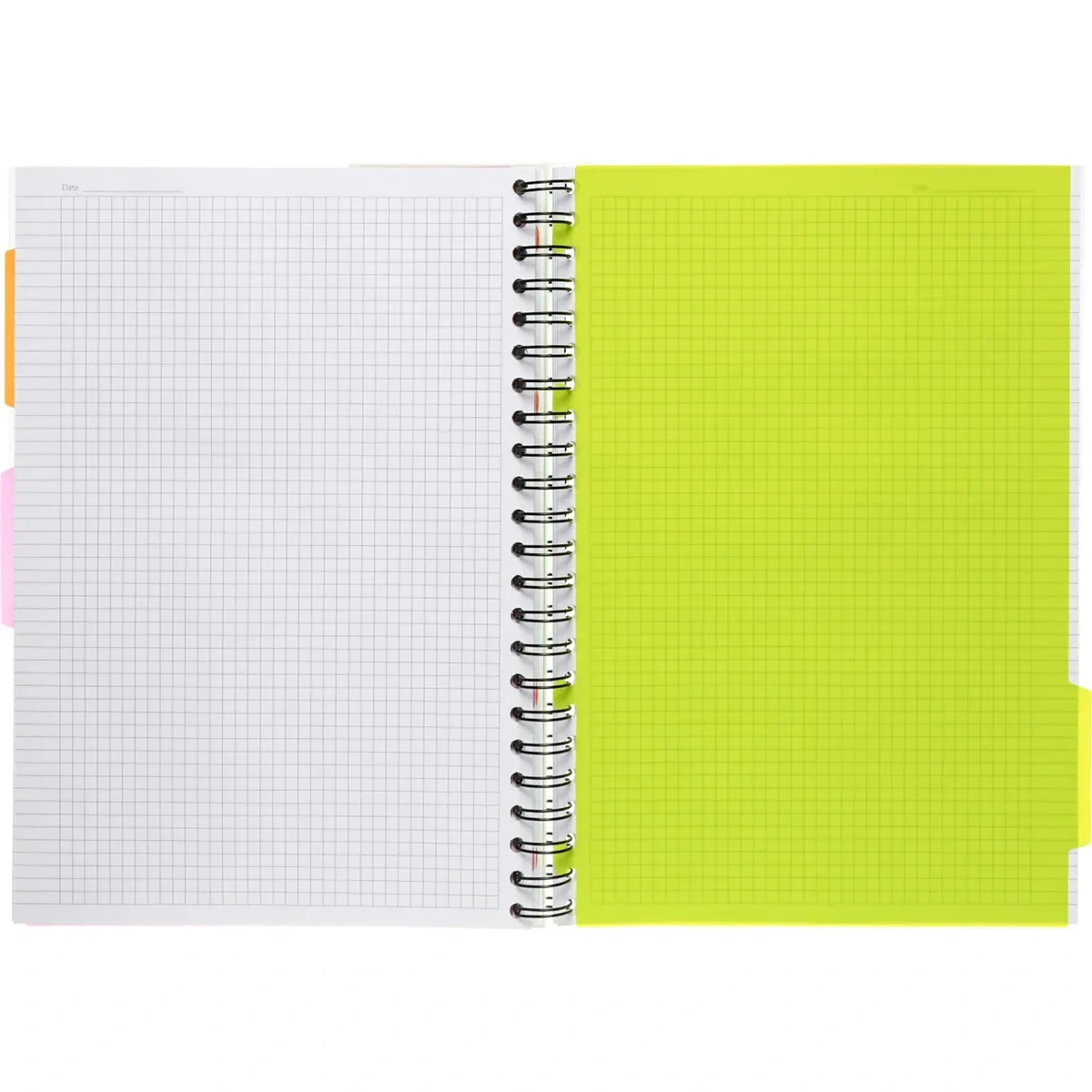 Бизнес-тетрадь формата А5, 140 листов. Обложка с вырубкой из жёсткого экологичного прозрачного пластика с волнистым рельефом, двойная толстая евроспираль, увеличенного диаметра. Пластиковые съёмные разделители. Первый лист из плотной бумаги с запечаткой, разлиновка в клетку с аккуратными полями. Серый дизайн. Размер — 147×204 мм.
