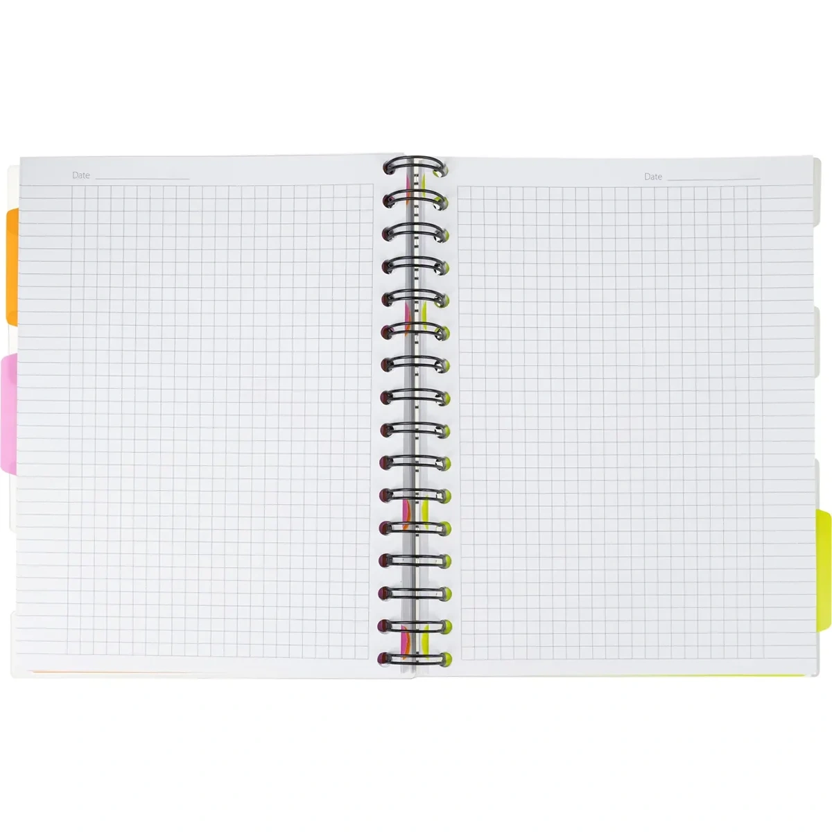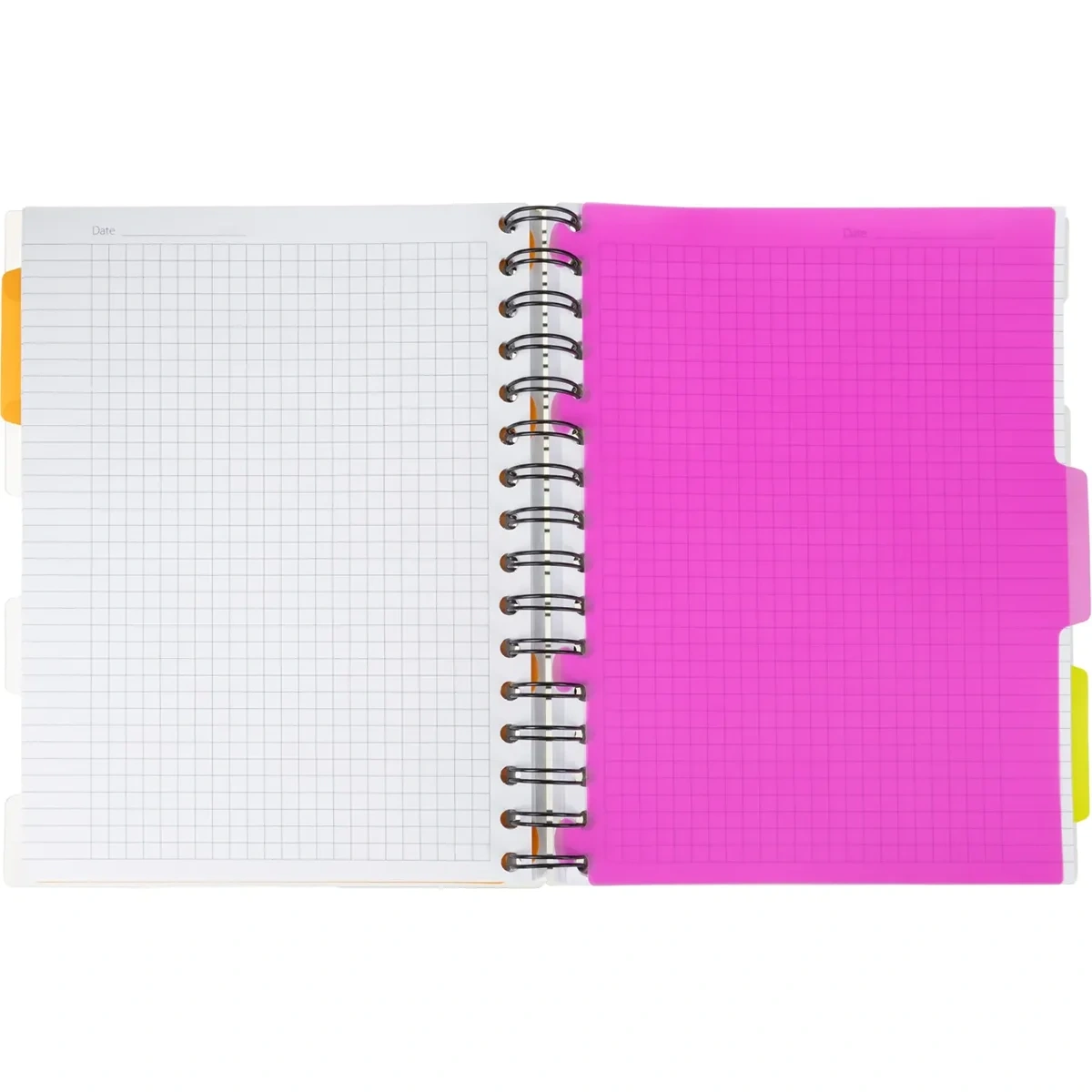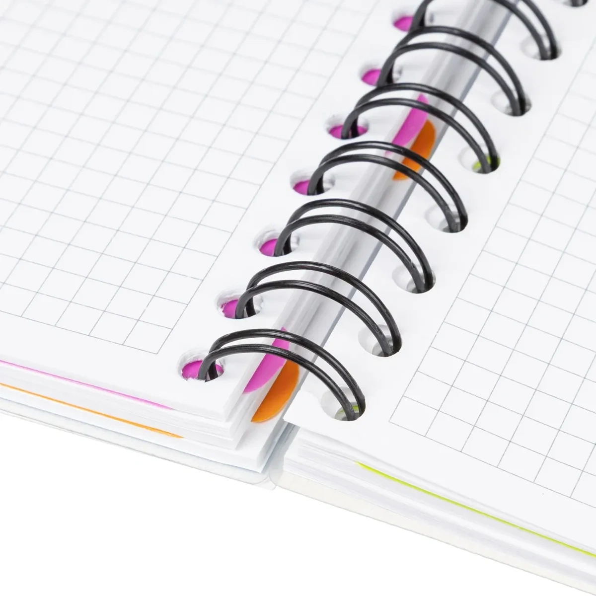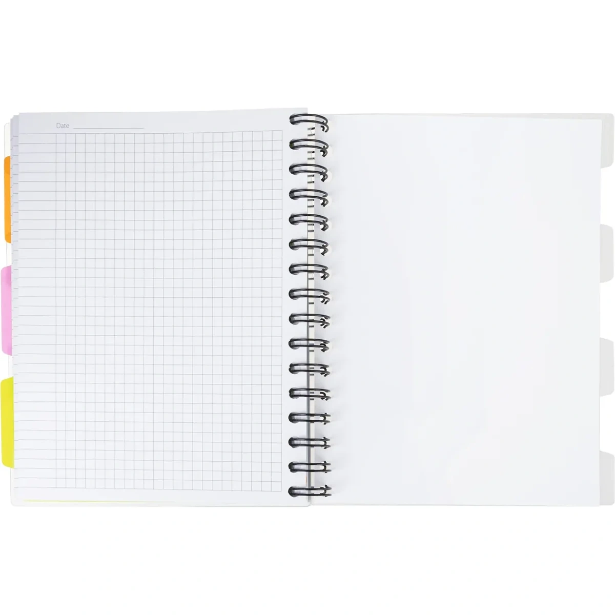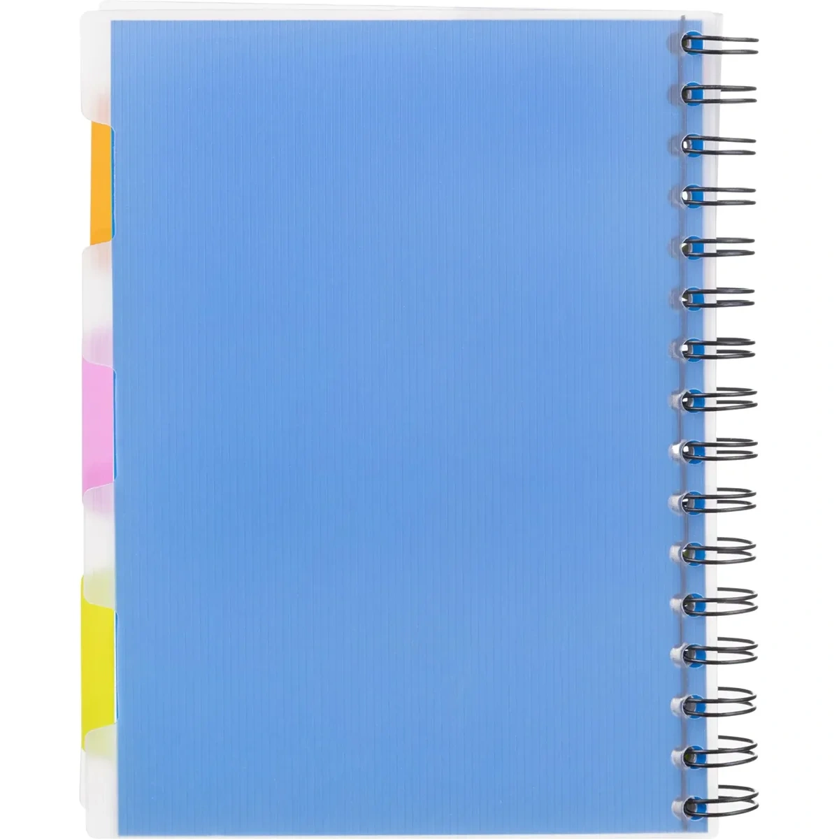 Бизнес-тетрадь формата А5, 140 листов. Обложка с вырубкой из жёсткого экологичного прозрачного пластика с волнистым рельефом, двойная толстая евроспираль, увеличенного диаметра. Пластиковые съёмные разделители. Первый лист из плотной бумаги с запечаткой, разлиновка в клетку с аккуратными полями. Синий дизайн. Размер — 147×204 мм.