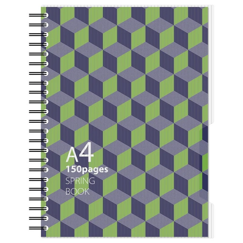 Бизнес-тетрадь «Spring Book» формата А4. Цвет обложки: синий/зеленый. Блок плотностью 65 г/кв.м состоит из тонированной, светло-зеленой бумаги. Содержит в себе 150 листов (300 страниц). Обложка из жесткого полупрозрачного пластика с волнистым рельефом. Обложка с вырубной формой для удобства перелистывания блока. Данная тетрадь имеет окрашенный торец блока. Наличие двойной толстой спирали увеличенного диаметра. Первый лист из плотного картона с запечаткой, разлиновка блока в клетку с полями.