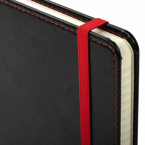 Твердая обложка стилизована под кожу черного цвета. Имеет закругленные уголки. Подходит для горячего тиснения. 80 листов позволят зафиксировать большой объем информации. Линовка блока в клетку (5х5 мм) дает возможность аккуратно заполнить цифровые значения, а также нанести чертежные зарисовки. Внутренний блок выполнен из офсета тонированного цвета плотностью 70 г/м2 и крепится к обложке с помощью книжного переплета. На внутренней стороне задней обложки есть декоративный конверт для разных мелочей в виде визиток, напоминалок и т. д. Снабжен резинкой-фиксатором, благодаря чему блокнот не откроется в сумочке или портфеле и листы не помнутся. Резинка-фиксатор и прострочка по периметру блокнота окрашены на контрасте цвета обложки, что придает блокноту изысканность и шарм. Дополнением является закладка-ляссе, с помощью которой при необходимости можно быстро открыть нужную страницу. Формат блокнота В5 (180х250 мм).