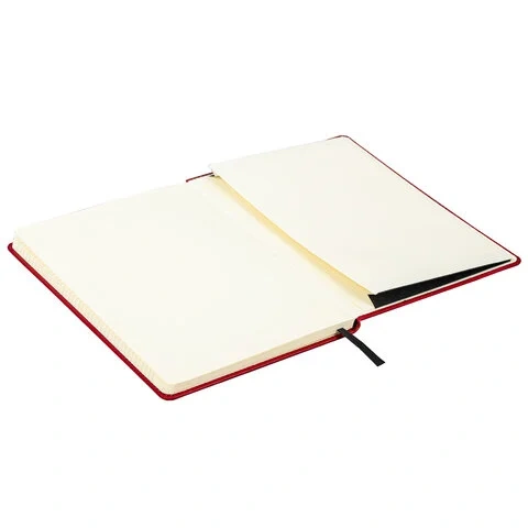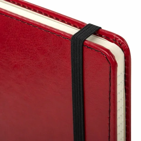 Твердая обложка стилизована под кожу красного цвета. Имеет закругленные уголки. Подходит для горячего тиснения. 80 листов позволят зафиксировать большой объем информации. Линовка блока в клетку (5х5 мм) дает возможность аккуратно заполнить цифровые значения, а также нанести чертежные зарисовки. Внутренний блок выполнен из офсета тонированного цвета плотностью 70 г/м2 и крепится к обложке с помощью книжного переплета. На внутренней стороне задней обложки есть декоративный конверт для разных мелочей в виде визиток, напоминалок и т. д. Снабжен резинкой-фиксатором, благодаря чему блокнот не откроется в сумочке или портфеле и листы не помнутся. Резинка-фиксатор и прострочка по периметру блокнота окрашены на контрасте цвета обложки, что придает блокноту изысканность и шарм. Дополнением является закладка-ляссе, с помощью которой при необходимости можно быстро открыть нужную страницу. Формат блокнота В5 (180х250 мм).