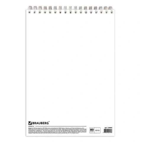 Блокнот формата А4 на евроспирали содержит 80 листов с линовкой в клетку, что позволяет зафиксировать большой объем нужной информации. Имеет жесткую подложку, позволяющую делать записи на весу и верхнее расположение переплета. Обложка выполнена из мелованного картона плотностью 200 г/м2. Внутренний блок состоит из белой офсетной бумаги плотностью 60 г/м2.