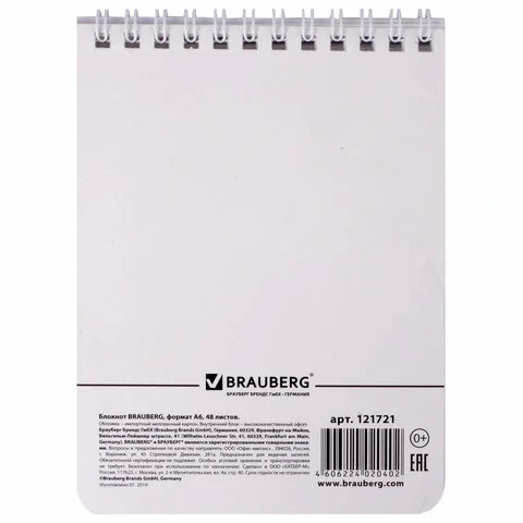 Блокнот формата А6 на евроспирали содержит 48 листов с линовкой в клетку, что позволяет зафиксировать большой объем нужной информации. Имеет верхнее расположение переплета. Обложка выполнена из мелованного картона плотностью 200 г/м2. Внутренний блок состоит из белой офсетной бумаги плотностью 60 г/м2.