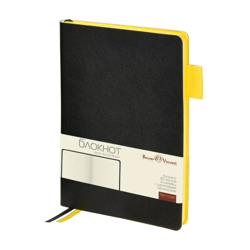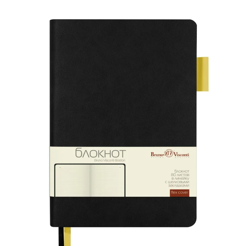 Блокнот Bruno Visconti Boston А5 80 листов черный в линейку на сшивке (145×213 мм, 1 штука в упаковке). Серия офисных блокнотов BOSTON от Bruno Visconti формата А5 — функциональный бизнес-аксессуар для ведения рабочих, личных записей. В нем нет ничего лишнего, но благодаря высококачественному переплетному материалу из экокожи и тактильно приятному покрытию Soft Touch он выглядит презентабельно. Гибкая (flex) обложка с углами закругленной формы, два ляссе в цвет обложки и среза, петля для ручки — наделяют блокнот практичностью. 80 листов блока в серую линовку помогают вести записи четко и аккуратно. Блок изготовлен из бежевой бумаги плотностью 70 кв/м.