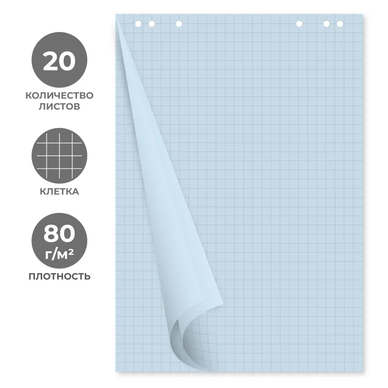 Бумага для флипчартов Attache Selection. Цвет — голубая пастель, разлинованы в клетку. 20 листов в блоке, размер блока 67.5×98 см, размер клетки 25×25 мм, бумага плотностью 80 г/кв.м, 6 стандартных отверстий. Блоки упакованы по 1 штуке в отдельный короб.