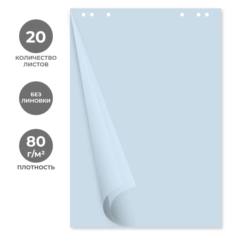 Цвет — голубая пастель, 20 листов в блоке, размер блока 67.5×98 см, бумага плотностью 80 г/кв.м, 6 стандартных отверстий.