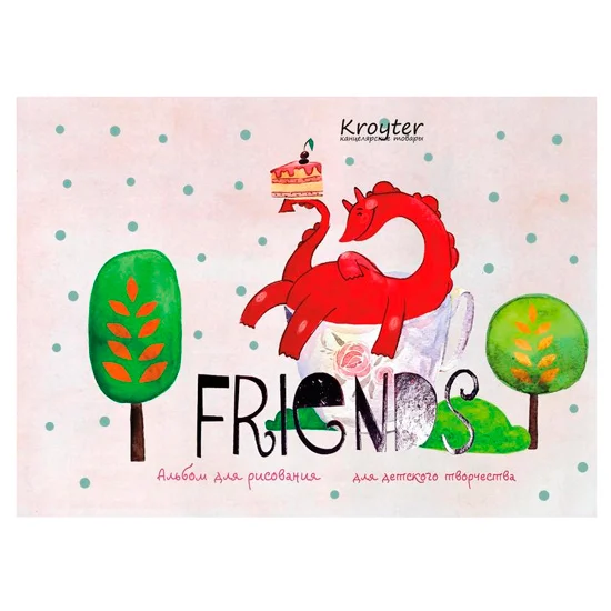 Альбом для рисования Kroyter «Друзья», формат А5, 40 листов. Обложка — импортный картон. Стильный авторский дизайн. Матовая ламинация. Ламинация придает обложке приятные тактильные ощущения и позволяет изделию дольше сохранить опрятный вид. Теснение фольгой. Блок — высококачественный офсет 100 г/кв.м, склеенный специальным образом, что позволяет изымать листы из блока без его разрушения. Предназначен для рисования карандашами ручками, фломастерами не рекомендуется для всех видов водорастворимых и масляных красок. Формат альбома A5 занимает меньше места в портфеле.