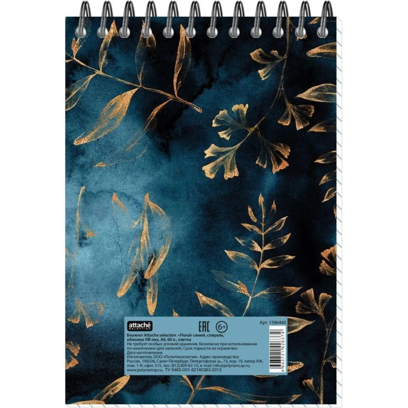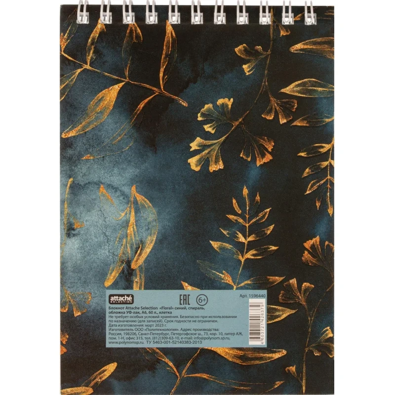Блокнот Floral представлен в формате А6. Размер изделия: 103×146 мм. Обложка сделана из мелованного картона. Плотность обложки и подложки: 200 г/кв.м. Бумажный блок содержит 60 листов белой, офсетной бумаги в клетку. Плотность блока — 60 г/кв.м. Тип крепления — спираль, сверху по короткой стороне.