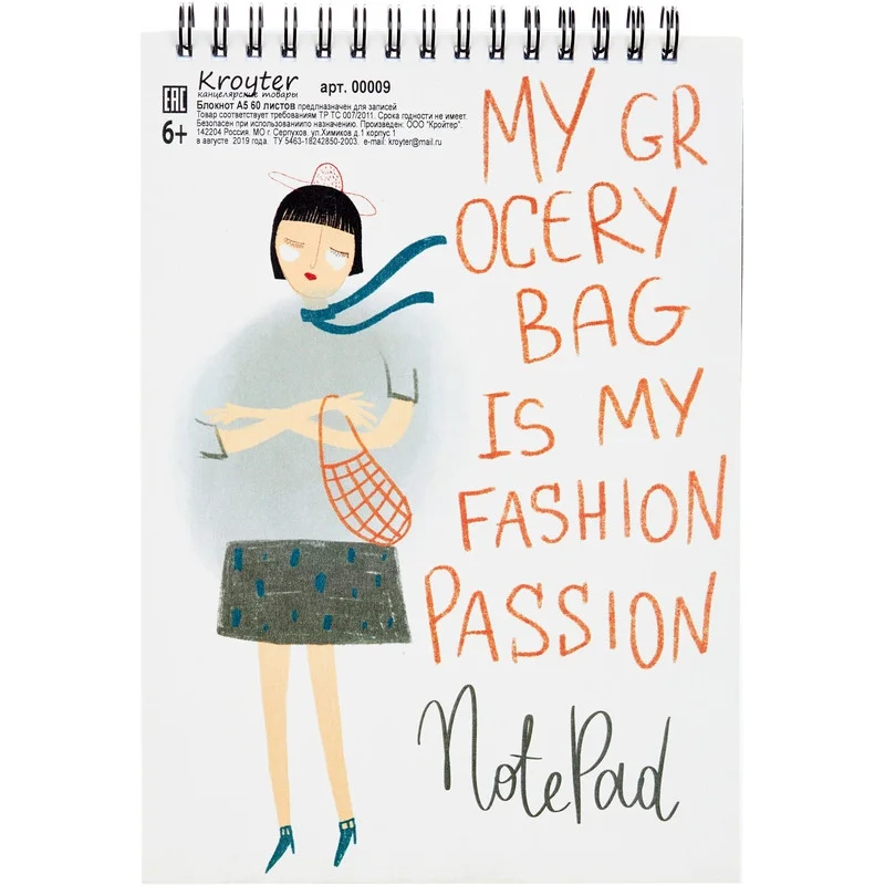 Блокнот Kroyter «В тренде» формата А5. Размер изделия: 145?206 мм. Содержит 60 листов (120 страниц) белой офсетной бумаги 100% белизны плотностью 65 г/кв.м в клетку. Блокнот на спирали. Предназначен для записей и зарисовок. Мягкая обложка выполнена из мелованного картона. Дизайн блокнота прекрасно дополнит рабочее место, а также отлично подойдет в повседневном быту.