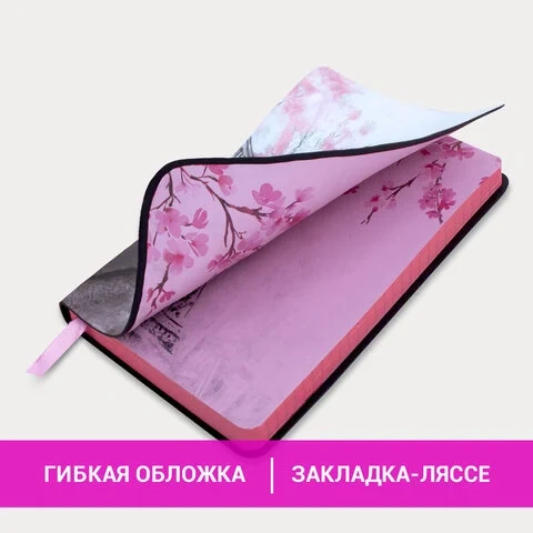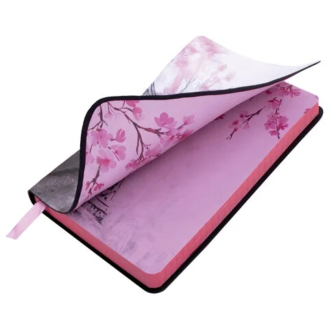 Внутренний блок включает 80 листов белой бумаги плотностью 70 г/м2. Благодаря малому формату А6 блокнот удобно использовать как в офисе, так и на выездных деловых встречах. Интегральная (мягкая) обложка с полноцветной печатью делает блокнот неповторимым и запоминающимся. Срез блокнота прокрашен, что придает ему особый шарм. Дополнением является закладка-ляссе, с помощью которой можно быстро открыть блокнот на нужной странице.