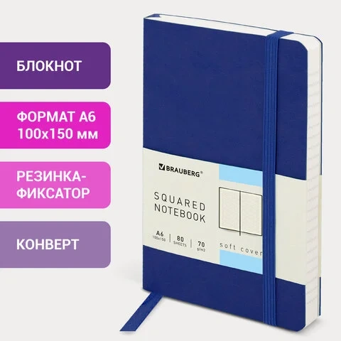 Мягкая интегральная обложка стилизована под кожу. Имеет закругленные уголки. Подходит для горячего тиснения. 80 листов позволят зафиксировать большой объем информации. Линовка блока в клетку дает возможность аккуратно заполнить цифровые значения, а также нанести чертежные зарисовки. Внутренний блок выполнен из офсета тонированного цвета плотностью 70 г/м2 и крепится к обложке с помощью книжного переплета. Снабжен резинкой-фиксатором, благодаря чему блокнот не откроется в сумочке или портфеле и листы не помнутся. Дополнением является закладка-ляссе, с помощью которой при необходимости можно быстро открыть нужную страницу. Формат блокнота А6 (100х150 мм) позволит владельцу поместить его в кейс или сумку малых габаритов.