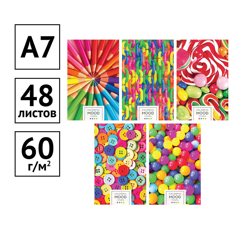 Блокнот формата A7 на склейке. Внутренний блок из 48 листов офсетной бумаги плотностью 60 г/м2, в клетку. Обложка изготовлена из мелованного картона.