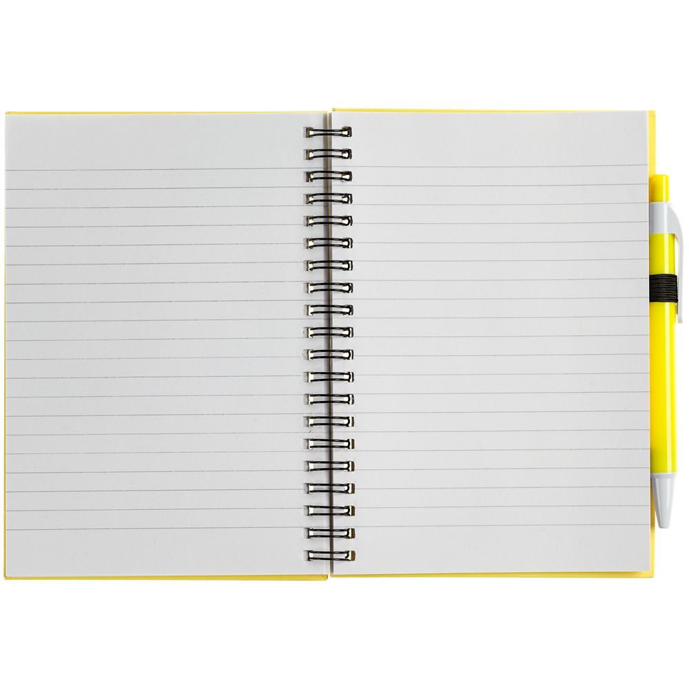 Блокнот с твердой обложкой, блок в линейку из вторично переработанной бумаги, 80 листов плотностью 70 г/м.В комплекте ручка с синими чернилами.Поставляется в полиэтиленовом пакете. Цвет: желтый. Размер изделия: ручка 1х13,5 см, блокнот 12,9х17,9 см. Материал: картон; пластик. Возможные виды нанесения: УФ-печать; Тиснение; Тампопечать; Шелкография (1 цвет);