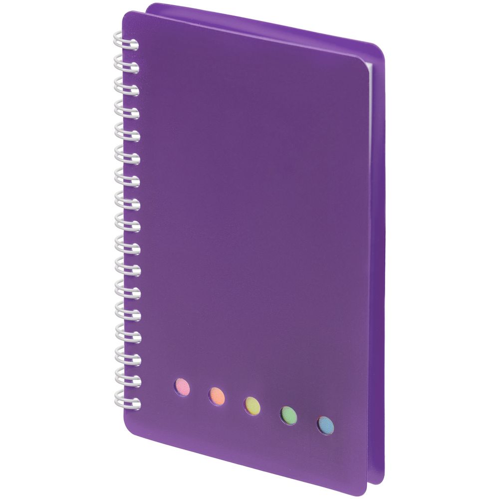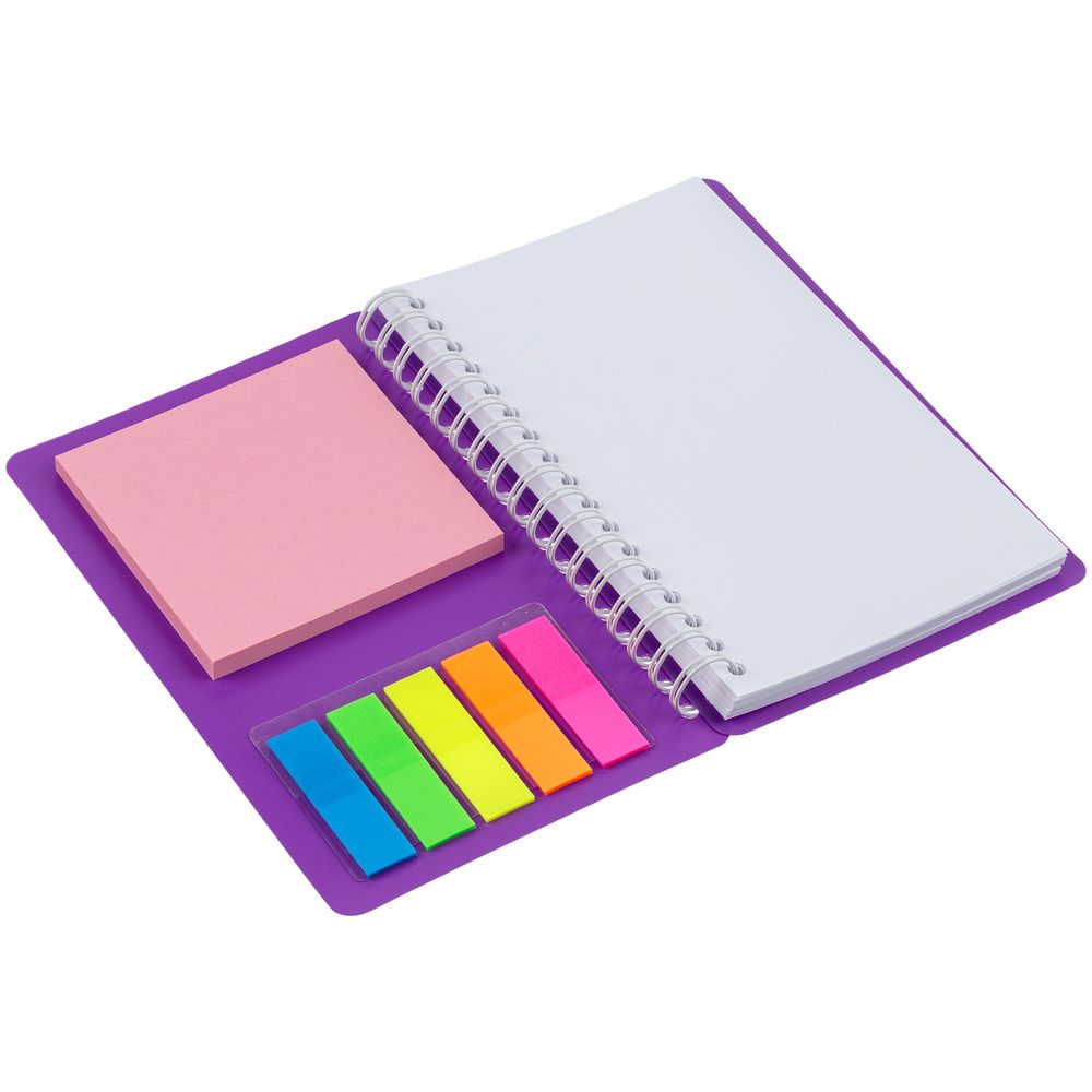 Материал обложки — пластик.Блок из белой бумаги, плотность 70 г/м, 72 листа;Блок листов с клейкой полосой без печати — 50 листов;Пластиковые закладки — 5 цветов по 25 листов. Цвет: фиолетовый. Размер изделия: 10,5х15,8 см. Материал: бумага; пластик. Возможные виды нанесения: Шелкография (1 цвет);