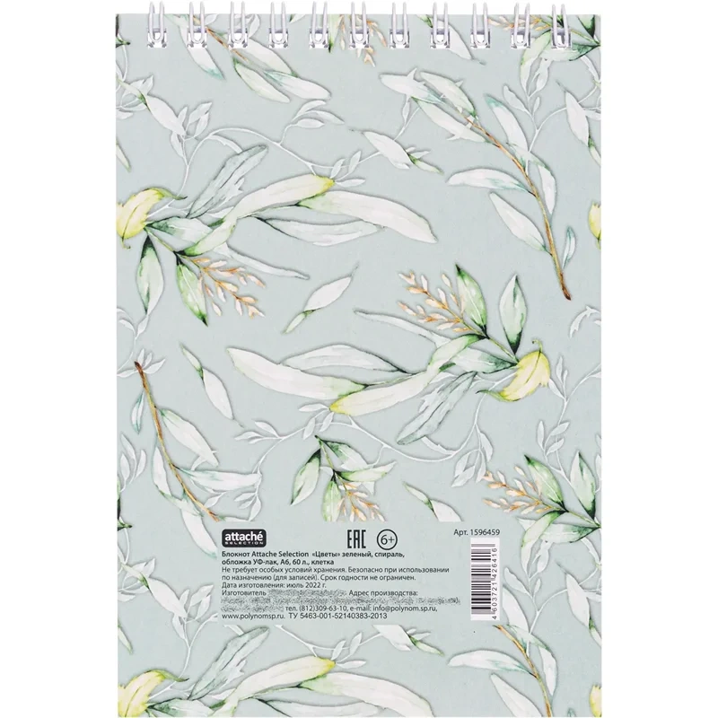 Блокнот «Цветы» представлен в формате А6. Размер изделия: 103×146 мм. Обложка сделана из мелованного картона. Плотность обложки и подложки: 200 г/кв.м. Бумажный блок содержит 60 листов белой, офсетной бумаги в клетку. Плотность блока — 60 г/кв.м. Тип крепления — спираль, сверху по короткой стороне.