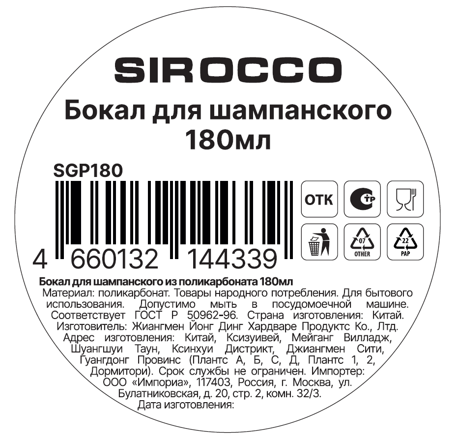 Бокал для шампанского Sirocco поликарбонат, 180мл