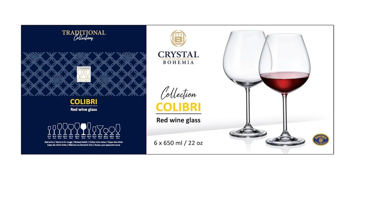 Набор бокалов для красного вина Crystal Bohemia Colibri, 650 мл х 6 шт. изготовлены из выдувного богемского хрустального стекла. Тюльпановидная форма чаши помогает вину дышать, делая аромат напитка более концентрированным и направляя его прямо к носу. Наличие титана в стекле и дополнительный обжиг ободка обеспечивают прочность. Набор состоит из 6 бокалов объемом 650 мл. Посуда не только комфортна в пользовании, но и смотрится красиво на повседневном или праздничном столе. Достаточно часто ее используют для сервировки стола, так как она удачно сочетается с любыми другими столовыми предметами. Она проста в уходе -ее можно промыть под проточной водой. После – тщательно высушить посуду мягкой салфеткой или бумажным полотенцем.