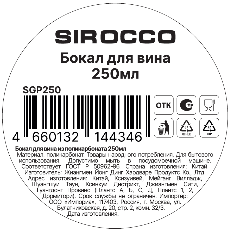 Бокал для вина из поликарбоната 250мл, имеет утонченную форму на ножке, которая позволяет удобно держать бокал в руке и может использоваться на различных объектах общественного питания. Посуда из поликарбоната используется в отелях с бассейнами, аквапарках, фитнес-центрах, банях, пансионатах, домах отдыха, на предприятиях с вахтовым методом организации работы, в различных медицинских учреждениях, таких как поликлиники, больницы, интернаты для престарелых. Бокалы пригодны для машинной мойки, устойчивы к царапанию и образованию пятен.