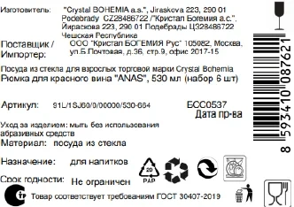 Набор бокалов для вина Crystal Bohemia Anas, 530мл x 6шт