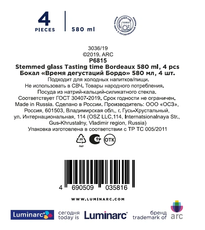 Набор бокалов Luminarc Время дегустаций Бордо, 580мл x 4шт