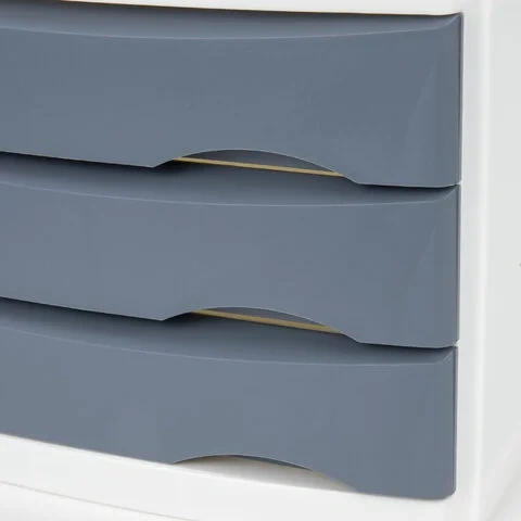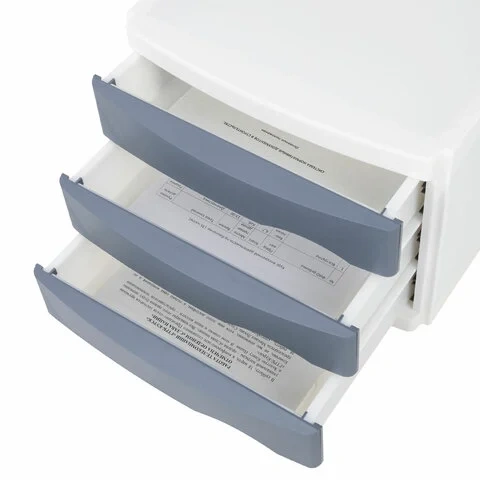 Бокс изготовлен из ударопрочного полистирола. Предназначен для хранения бумаг формата А4 и различных канцелярских принадлежностей. Представляет собой устойчивую конструкцию с тремя выдвижными лотками. Стильное сочетание светлого корпуса и серых лотков отлично впишется в любой интерьер. Размер: 235х300х355 мм.