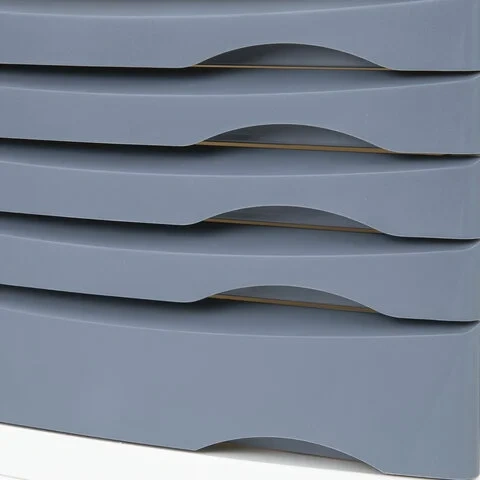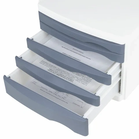Бокс изготовлен из ударопрочного полистирола. Предназначен для хранения бумаг формата А4 и различных канцелярских принадлежностей. Представляет собой устойчивую конструкцию с пятью выдвижными лотками. Стильное сочетание светлого корпуса и серых лотков отлично впишется в любой интерьер. Размер: 235х300х355 мм.