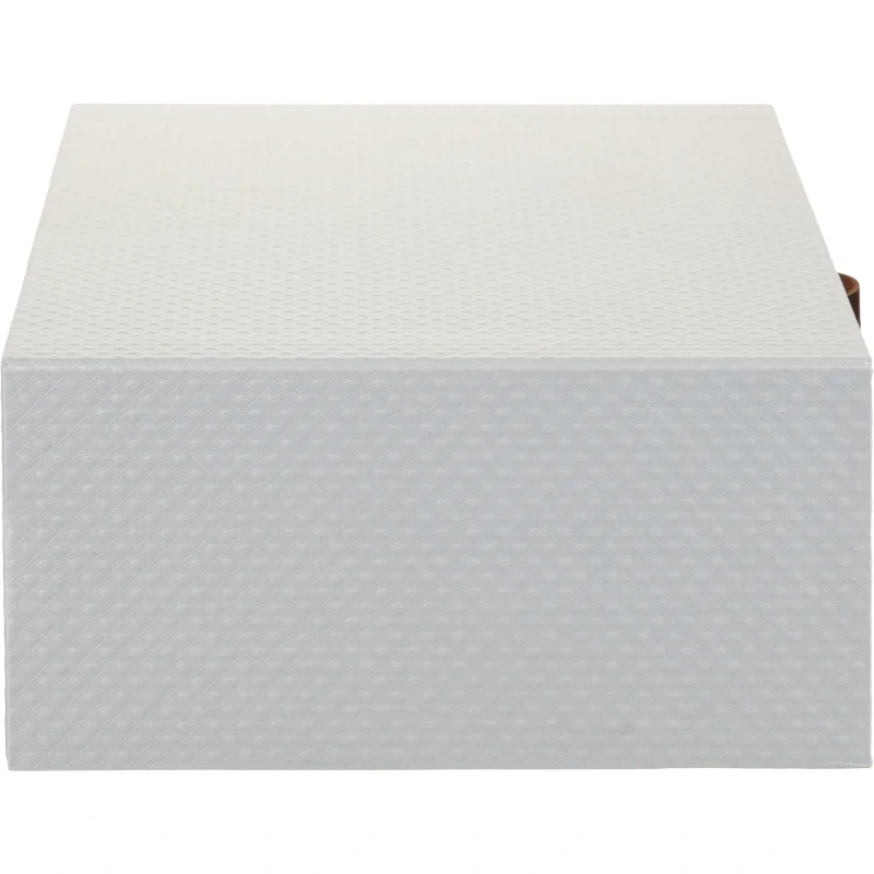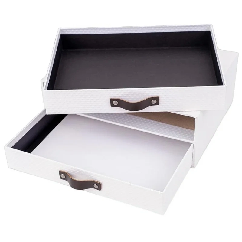 Бокс с выдвижными лотками Attache 2 выдв.лотка, белый, картон KVL-02-M2 Бокс с выдвижными лотками формата А4. Практичное и компактное решение для хранения вещей для дома и офиса. Стильный бокс создаст аккуратное рабочее пространство. Поставляется с кожаной ручкой для легкого доступа и придания дополнительного стиля. Бокс имеет 2 лотка. Лотки полностью съемные, внутри декорированы бумагой черного цвета. Легкие боксы удобны в транспортировке. Размер: 330x255x125 мм. Вес: 1.28 кг. Сам бокс выполнен из картона, снаружи декорирован дизайнерской бумагой белого цвета.