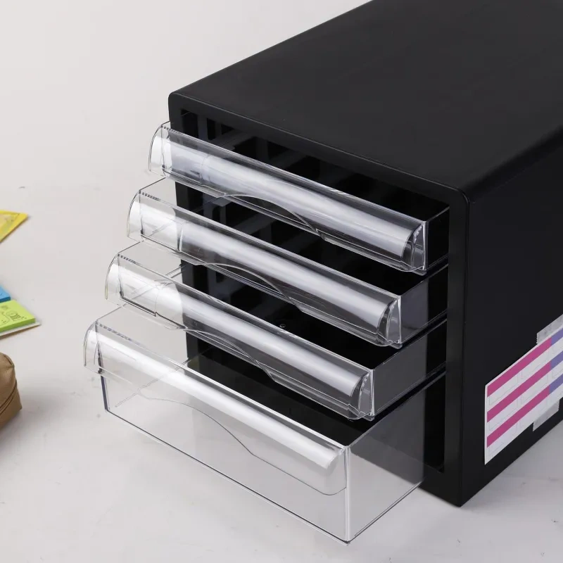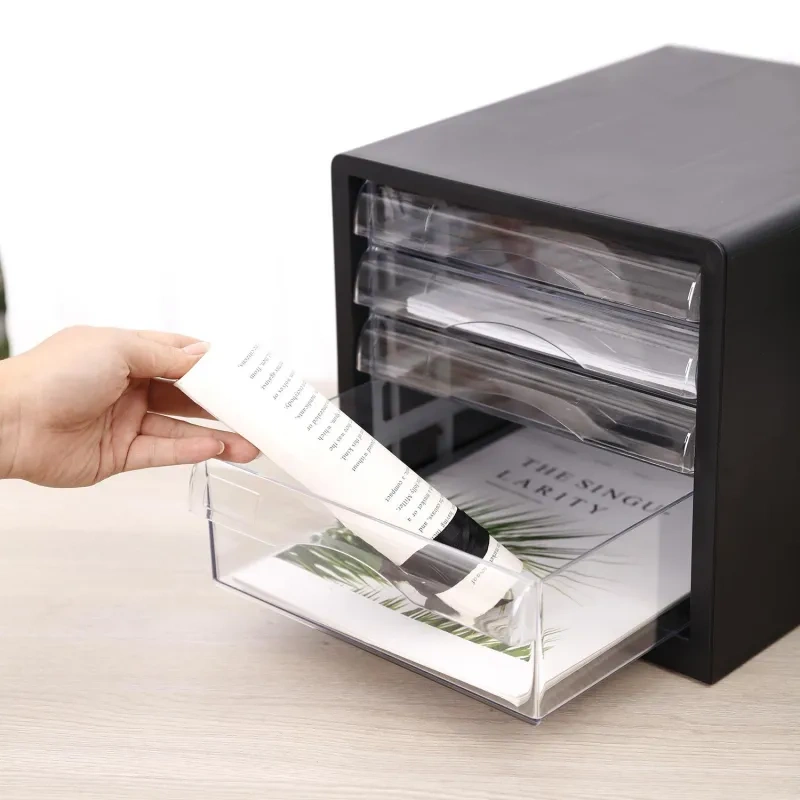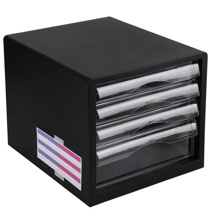 Органайзер для хранения прекрасно подойдет для мелких и крупных бумаг, фотографий и планшетов. Бокс с лотками отлично впишется в интерьер кабинета и офиса. Выполнен из прочного и высококачественного пластика. В бокс с четырьмя выдвижными лотками вмещается много канцелярских принадлежностей — вы сможете эффективно организовать пространство рабочего стола. На дне располагается противоскользящее покрытие, препятствующее скольжению и удержанию подставки.