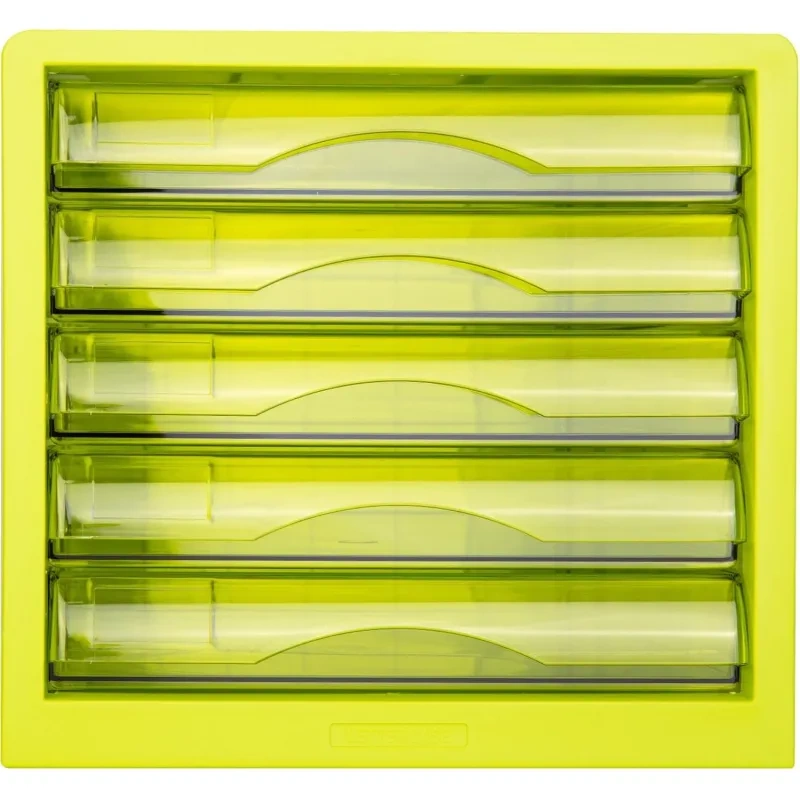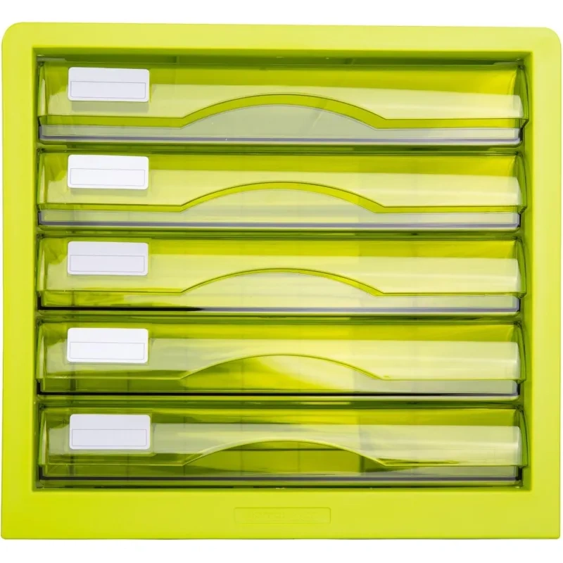 Органайзер для хранения прекрасно подойдет для мелких и крупных бумаг, фотографий, планшетов, личных вещей и много другого. Яркий бокс с лотками отлично впишется в интерьер комнаты и офиса. Выполнен из прочного и высококачественного пластика. В бокс с пятью выдвижными лотками вмещается достаточно большое количество канцелярских принадлежностей — вы эффективно экономите пространство рабочего стола. На дне изделия располагается противоскользящее покрытие, препятствующее скольжению и удержанию подставки.