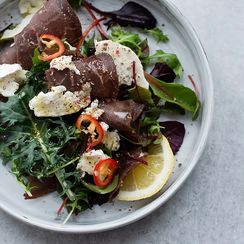 Традиционный сыровяленый итальянский деликатес, изготовленный из говяжьего филе. Постное мясо солят две недели, затем добавляют пряные специи и вялят два месяца. Калорийность продукта низка и потому он отлично подходит для диетического питания.