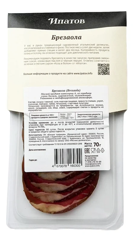 Брезаола из говядины Ипатов сыровяленая нарезка, 70г