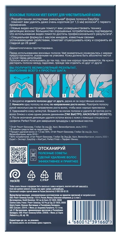 Полоски восковые Veet Expert для чувствительной кожи 12шт, 28г