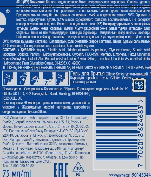 Гель для бритья Gillette Успокаивающий с алоэ, 75мл