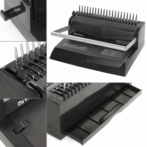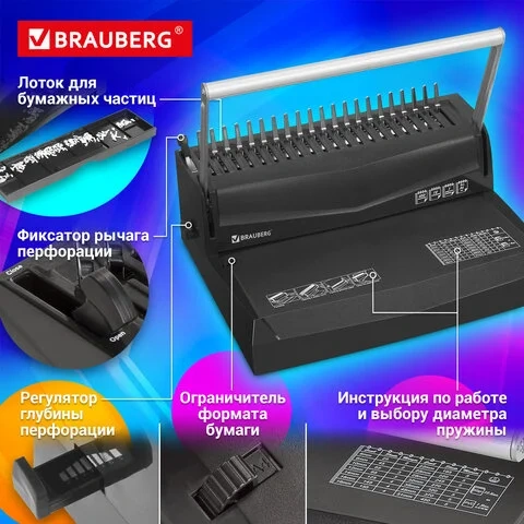 Переплетная машина для пластиковой пружины BRAUBERG для пробивания 12 листов идеально подходит для дома и небольшого офиса, где периодически возникает потребность в переплете документов. С ее помощью можно перфорировать 12 листов плотностью 80 г/м2 и подшивать 450 листов формата А4, А5 и А3 (в альбомной ориентации).