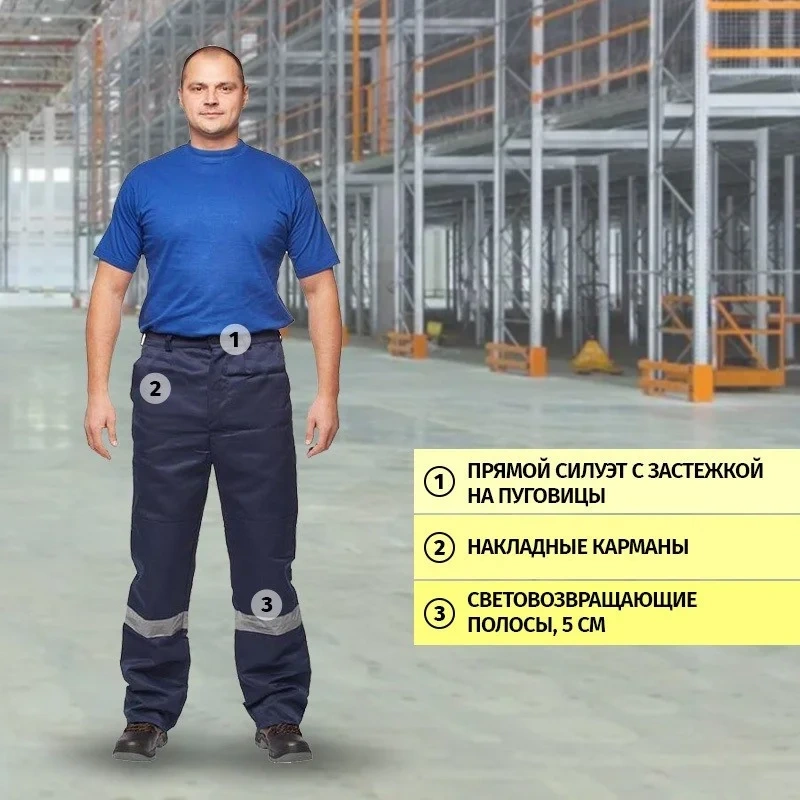 Брюки рабочие летние мужские л03-БР (размер 56-58, рост 158-164) синего цвета. Изготовлены из смесовой ткани с водоотталкивающей пропиткой (68% полиэфир, 32% хлопок), плотность ткани — 220 г/кв.м. Брюки прямого силуэта с застежкой на пуговицы и боковыми накладными карманами. Сигнальные элементы выполнены из световозвращающего материала.Соответствует стандарту ГОСТ 27575-87
