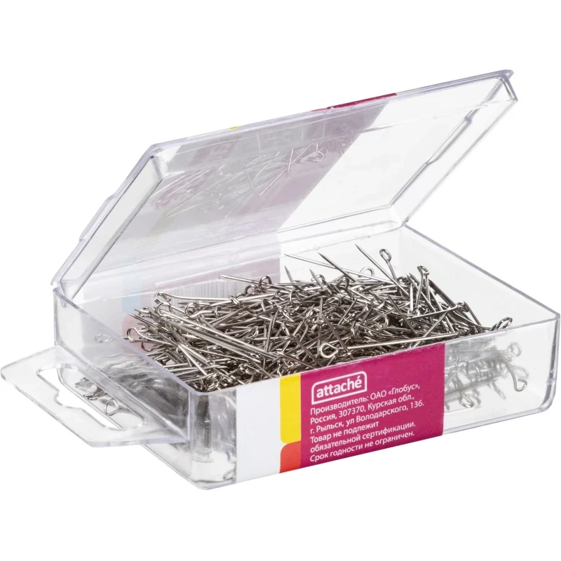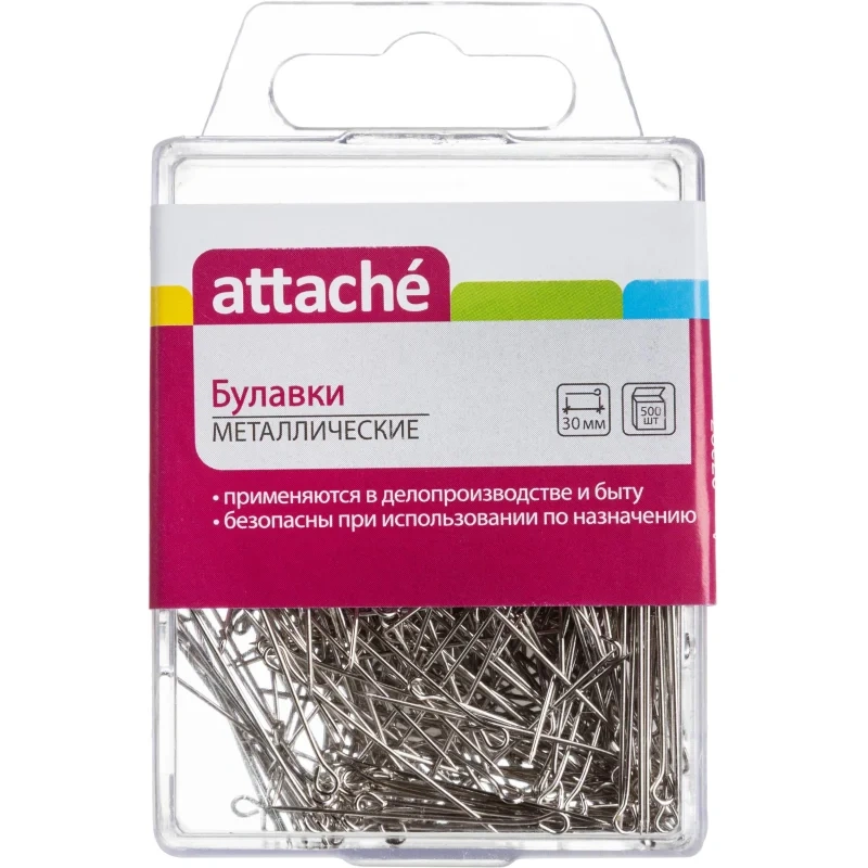 Металлические булавки Attache серебристого цвета имеют длину 30 мм. Используются для скрепления документов и для прикрепления объявлений на пробковые доски. В пластиковой упаковке с европодвесом 500 булавок.