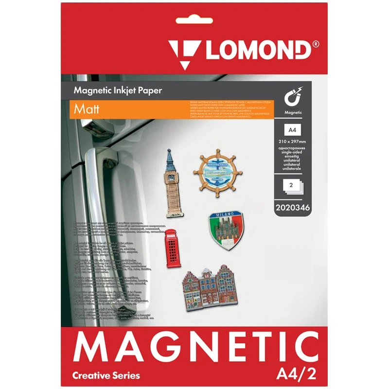 Листы Lomond 2020346 имеют плотность 620 г/кв.м и матовое покрытие. На этой бумаге оптимально совместимое разрешение печати до 5760 dpi. В комплект входит два листа с обратной магнитной стороной. Упаковка снабжена подробной информацией о характеристиках бумаги и о возможностях ее применения.