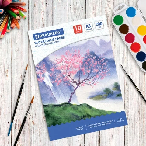 Бумага для акварели Brauberg А3, 200г/м2, среднее зерно, 10 листов