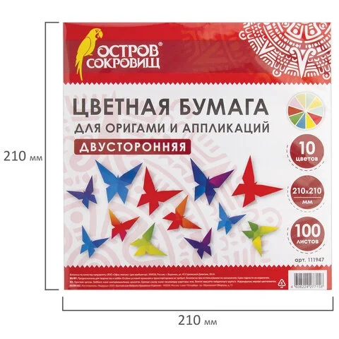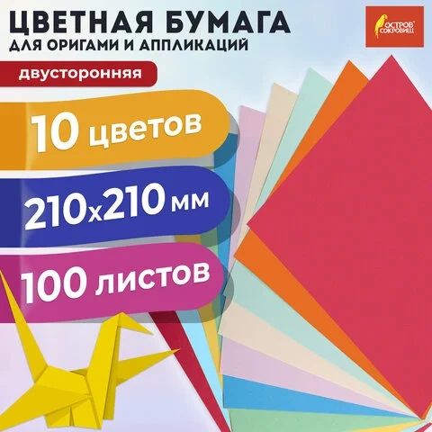 Бумага для оригами и аппликаций 21х21 см, 100 листов, 10 цветов, ОСТРОВ СОКРОВИЩ, 111947