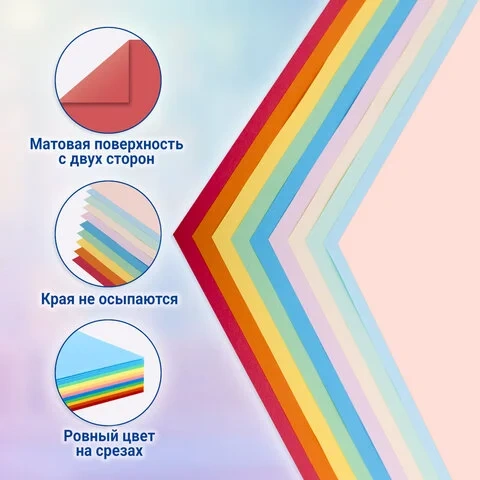 В набор входит 100 листов цветной бумаги для оригами размером 210х210 мм по 10 листов каждого цвета. Цветовая палитра - 10 цветов: 5 пастельных и 5 интенсивных тонов.