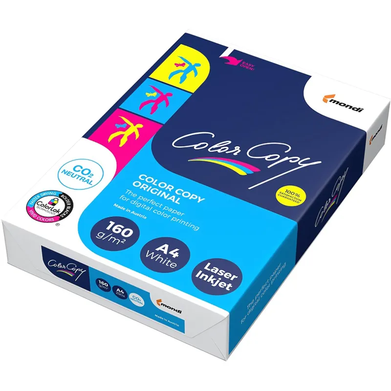 Бумага Color Copy формата А4 предназначена для печати на монохромных и цветных лазерных принтерах, на цветных копировальных аппаратах и на цифровых печатных устройствах. Плотность бумаги составляет 160 г/кв.м, толщина — 166 мкм, высокая степень белизны — 161%. Поверхность гладкая, с однородной структурой. Пачка содержит 250 листов. Превосходный визуальный эффект с яркими и точными цветами обязательно привлечёт внимание к Вашим материалам. Вы можете достичь всего этого с Color Copy благодаря широчайшей цветовой гамме на цветной лазерной печати. С Color Copy можно добиться передачи натуральных оттенков кожи и воспроизведения всей палитры цветов, даже таких сложных как жёлтый/зелёный. Высочайший цветовой охват достигается сбалансированными и оптимизированными свойствами бумаги. Специальная обработка поверхности Color Copy в сочетании с её гладкостью гарантирует чёткость цветовоспроизведения в самом широком спектре. Предназначена для односторонней и двусторонней печати.