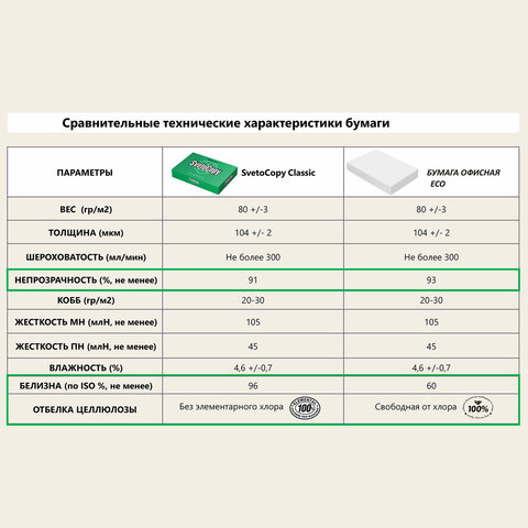 Натуральный цвет каждого листа White Box/SvetoCopy Eco достигается благодаря применению меньшего количества отбеливающих веществ. Уровня белизны 60% (ISO) достаточно для выполнения функции носителя информации.