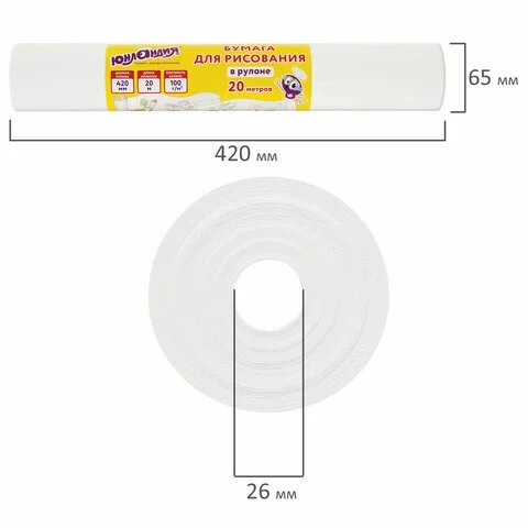 Новый формат бумаги для рисования 'в рулоне', позволит использовать её на столе, мольберте, полу и даже на стене. Внутренний диаметр втулки 26 мм подходит для крепления на специальных мольбертах и подставках для рисования. Рулон бумаги плотностью 100 г/м2 имеет ширину 42 см и длину 20 метров.