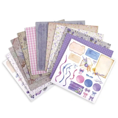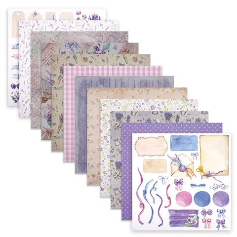В набор входит 12 листов двусторонней бумаги плотностью 180 г/м2, содержащих 12 вариантов дизайна: 10 фоновых дизайнов и 2 набора с фигурными вырубками для вырезания. Стандартный размер бумаги 30х30 см делает её удобной для использования в создании скрап-альбомов. Матовая бумага отличается высоким качеством печати.