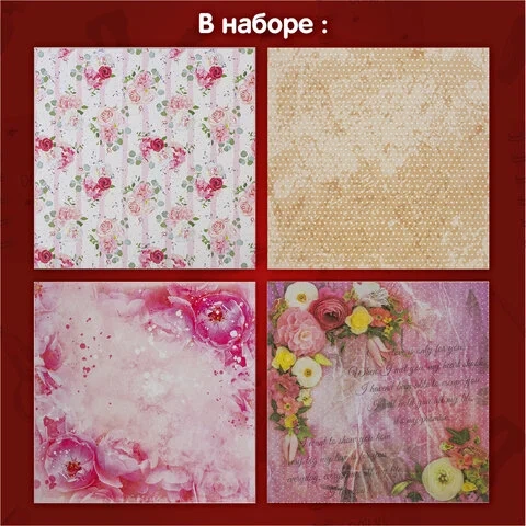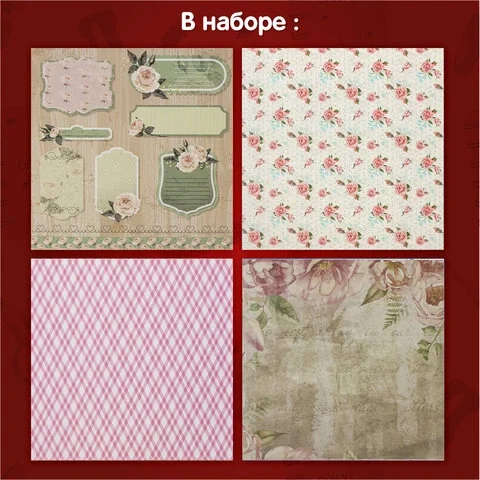 В набор входят 12 листов двусторонней бумаги плотностью 180 г/м2, содержащих 12 вариантов дизайна: 10 фоновых дизайнов и 2 набора с фигурными вырубками для вырезания. Стандартный размер бумаги 30х30 см делает её удобной для использования в создании скрап-альбомов. Матовая бумага отличается высоким качеством печати.
