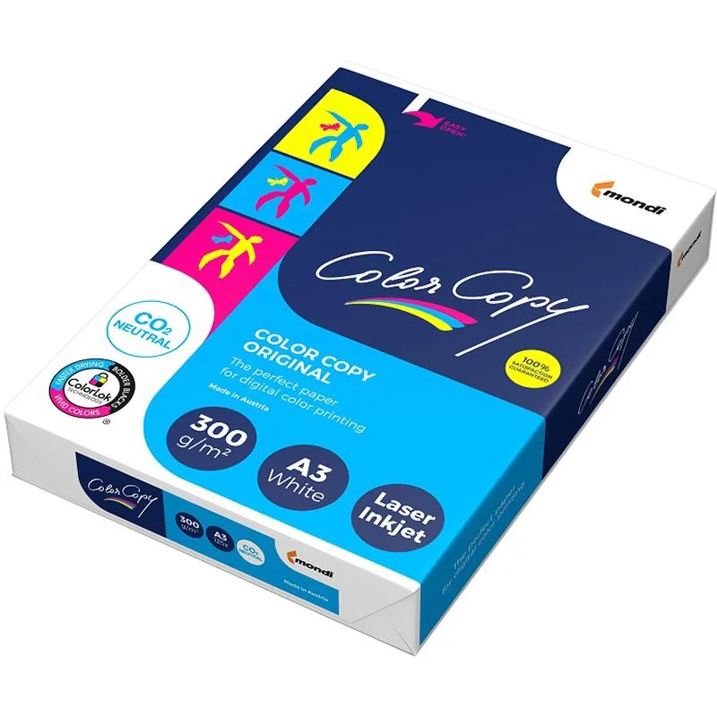 Бумага Color Copy формата А3 предназначена для печати на монохромных и цветных лазерных принтерах, на цветных копировальных аппаратах и на цифровых печатных устройствах. Плотность бумаги составляет 300 г/кв.м, толщина — 305 мкм, высокая степень белизны — 161%. Поверхность гладкая, с однородной структурой. Пачка содержит 125 листов. Превосходный визуальный эффект с яркими и точными цветами обязательно привлечёт внимание к Вашим материалам. Вы можете достичь всего этого с Color Copy, благодаря широчайшей цветовой гамме на цветной лазерной печати. С Color Copy можно добиться передачи натуральных оттенков кожи и воспроизведения всей палитры цветов, даже таких сложных как жёлтый/зелёный. Высочайший цветовой охват достигается сбалансированными и оптимизированными свойствами бумаги. Специальная обработка поверхности Color Copy в сочетании с её гладкостью гарантирует чёткость цветовоспроизведения в самом широком спектре. Предназначена для односторонней и двусторонней печати.