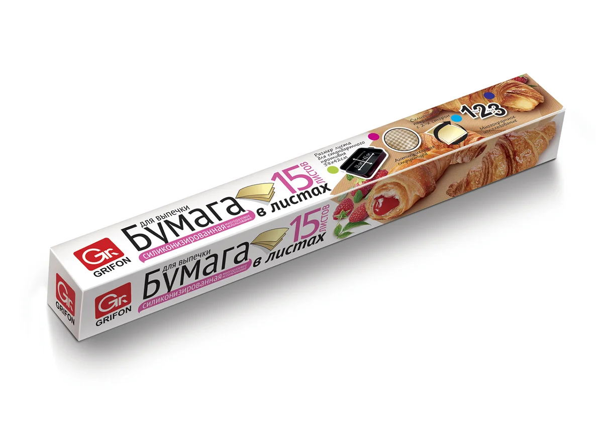 Бумага Grifon силиконизированная для выпечки, 38 см x 42 см, 15 листов обладает влаго- и жиронепроницаемостью. Эти полезные качества делают его использование удобным и практичным как в домашнем хозяйстве, так и в хлебопекарном производстве. Он предназначен для выпечки, запекания, разогрева. Силиконизированный пергамент не требует промасливания. Эффективные жиро— и влагоразделительные характеристики пергамента GRIFON позволяют избежать прилипания выпечки к формам и противням, подгорания продуктов и утомительной очистки рабочих поверхностей. Максимальная температура использования пергамента Grifon составляет +250С. Это оптимальный температурный режим как для электрических, так и для газовых духовых шкафов.