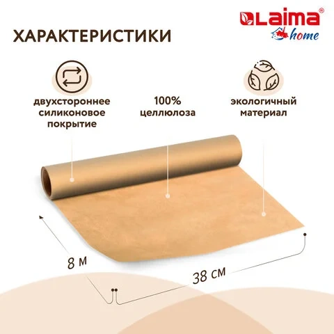 Силиконовое покрытие позволяет готовить без использования масел и жиров, что существенно экономит усилия по поддержанию чистоты рабочих поверхностей – противней и форм для выпечки. Бумага для выпечки характеризуется высокой степенью жиростойкости и влагостойкости, не прилипает к тесту и форме, а также предотвращает пригорание. Выдерживает температуру до 220°С. Подходит для многоразового использования. Плотность – 41 г/м2. Размер рулона – 38 см x 8 м.